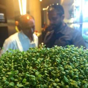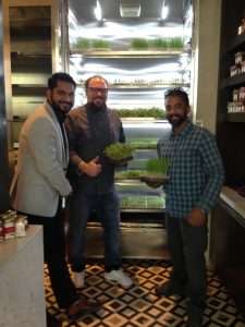 UGF Farms completed this Microfarm installation from design to manufacture. Pictured are Chef Alex and Vimal of the Andaz Hyatt along with Linesh Pillai of UGF Farms.